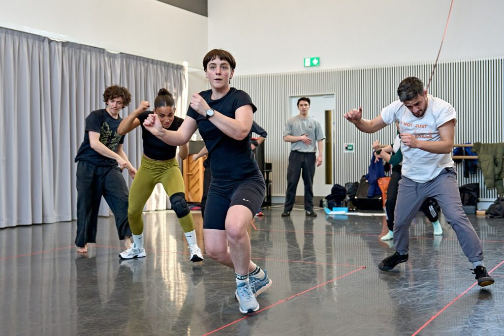But the boldest choice of the whole show was to have Ophelia (played by Ami Tredrea) repeat Hamlet’s “To be or not to be” soliloquy just before her suicide. This scene and the one immediately before it form one of the strongest parts of the whole show. In that previous scene, Ophelia stands as a focal point for the rest of the characters while Gertrude desperately tries to reach her through the haze of grief-driven madness. This remake preserves every word of the original script but has Ophelia sing a heartbreaking rendition of Sail to the Moon. The image of Ophelia swaying on a platform while the other characters look on, completely lost as to how to help her, is an unforgettable one. Besides giving Ophelia some much-needed agency (sorry, William!), this also serves to solidify her and Hamlet as essentially soulmates. It is clear that the darkness he recognised in the world was visible to her too. The audience is placed within an interesting relationship with this darkness. From the very beginning, Hamlet Hail to the Thief stands out as an unabashed, artistic protest. The vision of Elsinore is that of a truth-repressing, watchful state, and with stadium-like seating around a small stage that’s visible at all angles, you very much feel like you are complicit in the watching. The simplicity of the stage setting adds to this, with black suits that hang ominously from the ceiling, and a crate on each of the two downstage corners that act as platforms.