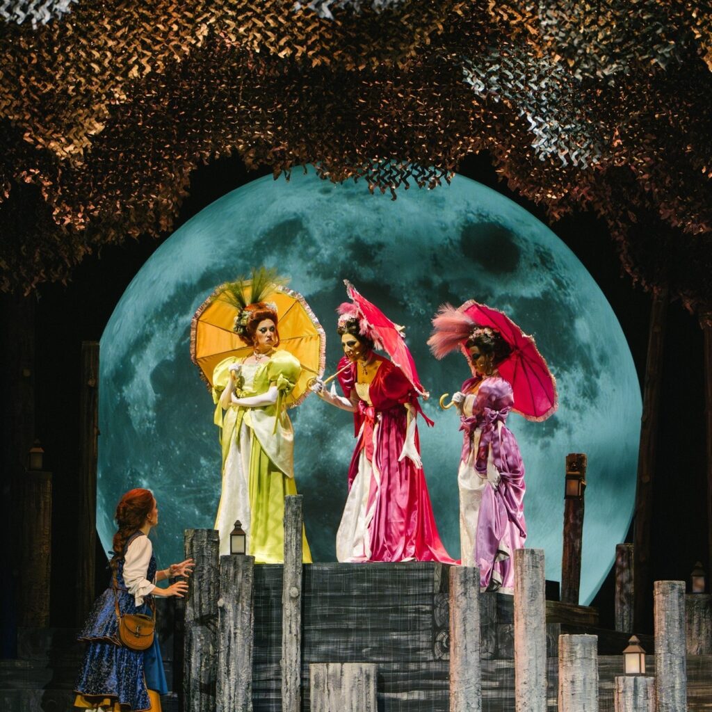 I have to acknowledge the world created here. Production design by Matthew Cassar was a standout: a greyscale, pop-up storybook forest. It was dense, layered, and it worked. The physical set is made up of staircases, narrow platforms, and limited space to roam. With big gowns and heels, navigating the space must have been a challenge, yet the cast moved through it with impressive ease.