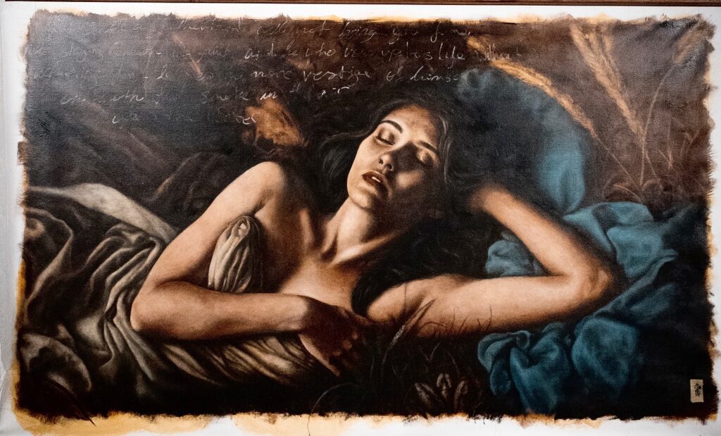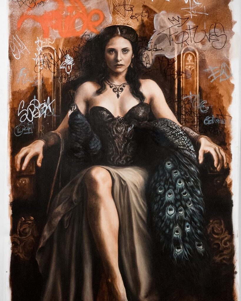 The first painting representing ‘’Ego’’ is seductive. Royal, regal and poised, she sits and stares out from a throne adorned with peacock feathers, rendered in a rich chiaroscuro style reminiscent of Baroque portraiture. Yet the surface is vandalized—graffiti litters her backdrop like a series of battle scars defacing an otherwise ‘’royal portrait’’.