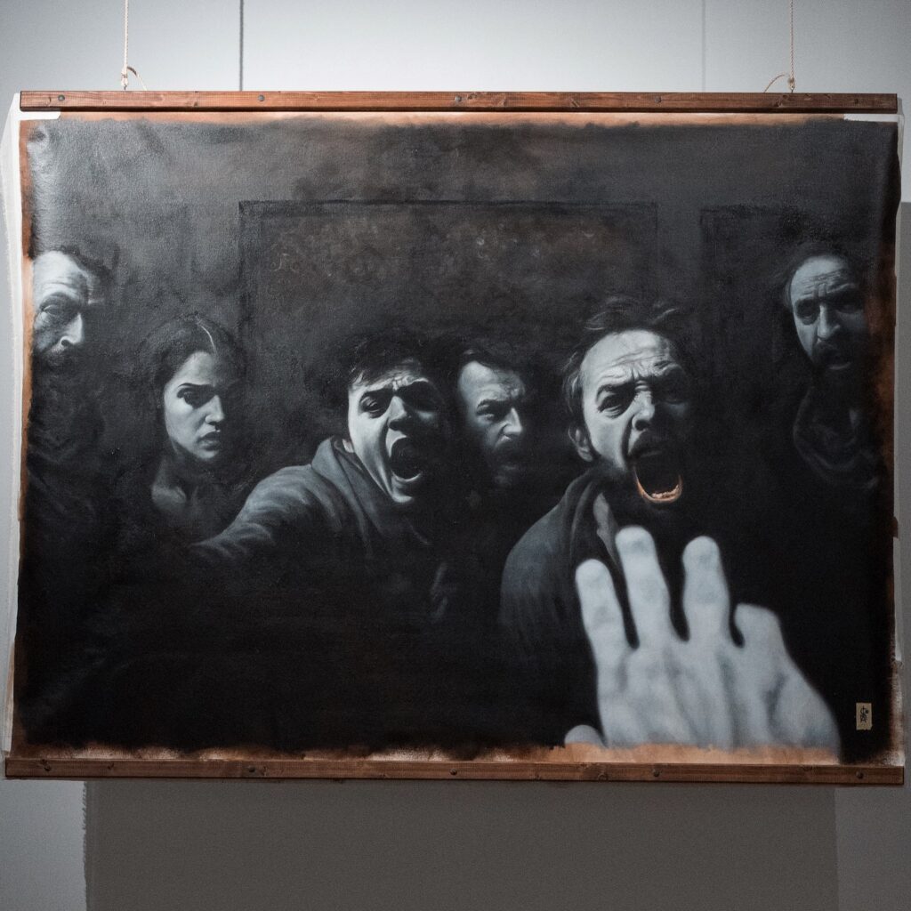 One of the more striking exhibited paintings, is one of the largest and cinematic of the lot. A quasi-monochromatic tableau depicting an angry crowd in mid-scream, with contorted faces leaping towards the viewer in what can be described as nothing more than rage and anguish in their purest of forms, while a pale hand stretches out towards them possibly pleading for mercy begging them to stop. The tension is unbearable. It captures something visceral about the social unrest we seem to be surrounded by in this day and age. A frenzy of cut-throat, cancel culture and collective judgment as we stand not so far from the madding crowd.