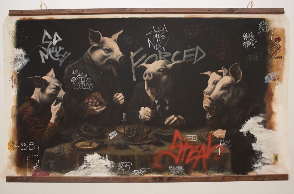 Satire then crashes through the classical reverie of imagery in the form of a grotesque reimagining of The Last Supper. Here, the disciples are replaced by pig-headed men in suits, feasting beneath graffiti that reads “MEAT,” “FORCED,” and “FREE ENTRY.” It’s a dark parody of indulgence, consumerism, and moral decay – a modern day socio-political tableau of gluttony.