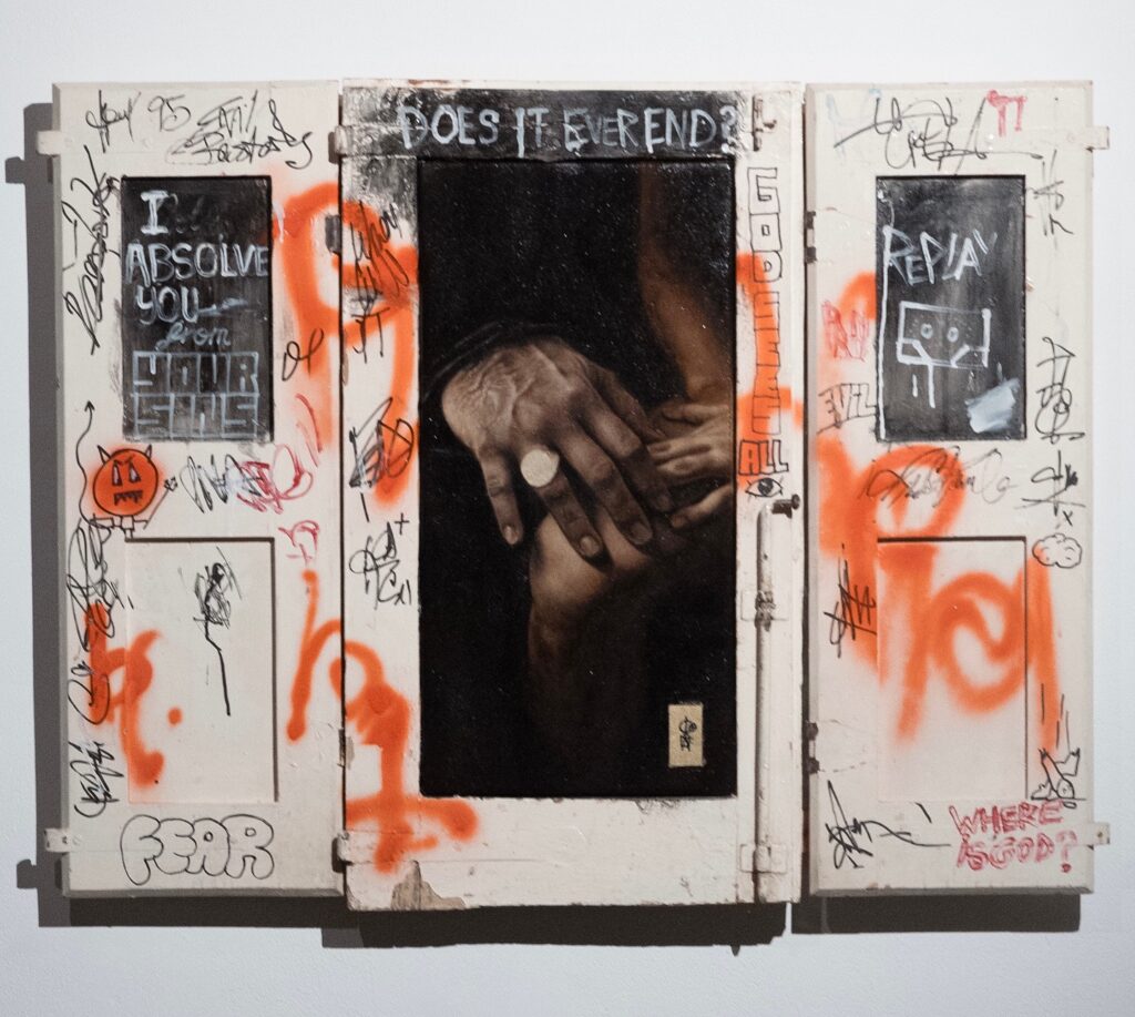 The adjacent exhibition wall shows a message sprayed onto the wall mocking the very notion of grandeur: “Oh mighty ego, how does it feel to be so impossibly perfect and superior to everyone else?” The tone is sarcastic and biting, an indictment not only of the subject but also of our culture’s obsession with self-image, dominance, and perfection. These spray painted messages, serve to echo the social commentary not of the condemnation of the human condition, but rather of the excavation of its complexities like a series of didactic murals.