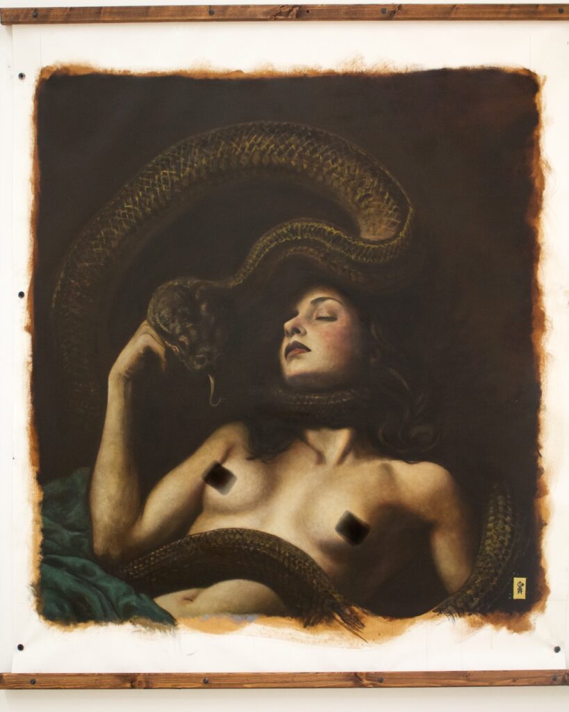 In other spaces, mythological allusions seep into the frameless and sinful imagery. A nude woman lies entwined with a coiled serpent, her expression serene, even blissful. The serpent here is not simply a symbol of sin, but one of transformation, temptation, and envy. An envy that has the potential to consume until left breathless.