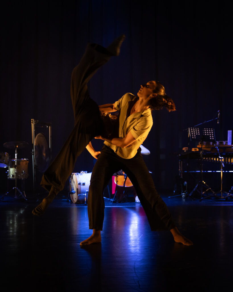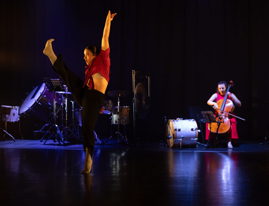 A fundamental aspect that shaped the audience’s experience was the staging. The performance space, with its wings removed to create an expanded stage, featured a panoply of percussion instruments ranged along the back wall, while cellist, Silvia Gira, was also positioned towards the back but in a central placement. With the musicians at the back of the stage, a significant space was left at the forefront of the stage. This spatial arrangement presented an immediate dramaturgical question. While placing the instruments and musicians visibly in the performance space is crucial for an evening celebrating live music, the resulting distance between audience and musicians made it difficult to engage fully with the purely musical interludes. The void seemed to anticipate the entry of the dancers, creating a sense of waiting and expectation during the moments they were absent.