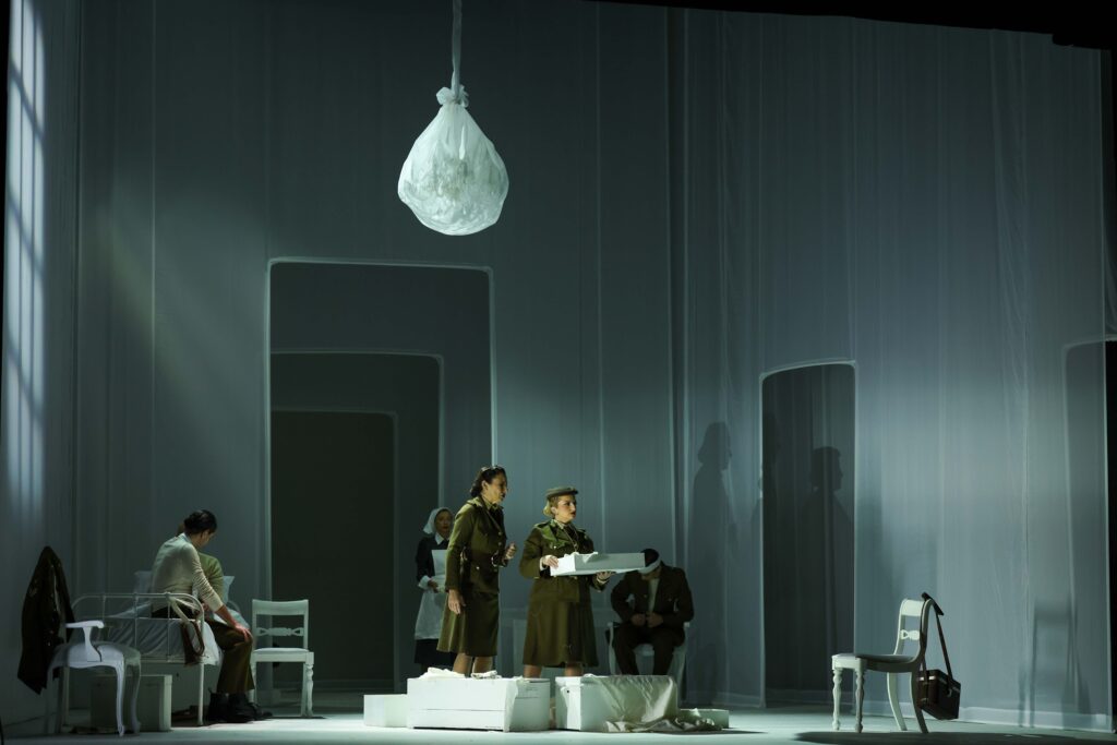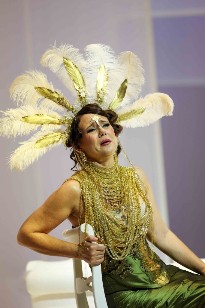 So the question arises: what to do dramaturgically during these long numbers that repeat the same poetic phrases and music? In Il Parnaso, the answer was to fill the space with comic set pieces. These kept the scene busy but sometimes it felt lacking in motivation. The work is already a funny idea to begin with: Apollo summons Melpomene, Euterpe and Erato to honour the wedding of Holy Roman Emperor Joseph II and Maria Josepha of Bavaria (which was the actual occasion of the work itself), but as the Muses learn that the festivities are taking place tomorrow, they panic and squabble, each vying to assert her own art over her sisters’. Not only that, it’s already a contemporary satire on Classical archetypes and in some sense looks ahead to the operas of Jacques Offenbach (in the second half of the 19th century) or to those of Richard Strauss and Hugo von Hofmannsthal (in the first half of the 20th). The addition of the historical reference (a 1920s cocktail party) in this instance distracted from the wit of the original work itself.