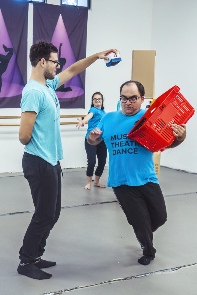 The customers, after a dramatic countdown, run out in even more dramatic slow-motion, all fighting over unlabeled boxes like rabid animals. In every scene, the performers used exaggerated gestures, sound effects, and playful interactions with the audience to heighten the comedy and make the lessons simple, but not condescendingly so. The different elements, especially in the relatively small space of Spazu Kreattiv’s stage, were impressively blended together, and the whole thing felt altogether seamless—an element easier said than done when you have very excited children close to the performers reacting to everything they’re seeing. In such a space, a creatively limited, not overwhelming amount of props is important and was again pulled off brilliantly by the production team. The main prop, in fact, was just a box that consequently served as a ritualistic drum, a giant trashcan, and even a space from which actors first emerged to the young audience’s wide-eyed amazement.
